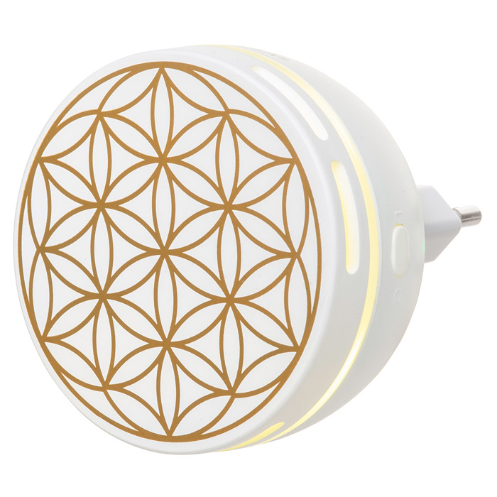 Die seitlich ausstrahlende, warme LED-Beleuchtung kann während des Betriebs separat ein- und ausgeschaltet werden und ergänzt die Duftanwendung mit einer entspannenden, atmosphärischen Lichtstimmung. Auf warm-weißem Hintergrund erstrahlt das goldene Design der Lebensblume als Kraftsymbol für Harmonie und bietet eine dekorative Bereicherung Deiner Wohn- und Arbeitsräume.